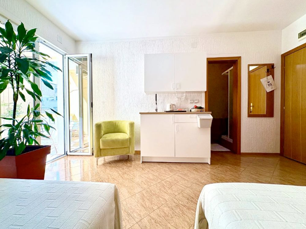 Studio 03 (№ 5, 11, 17): 23m2, terrace, double bed + extra bed, kitchenette, private bathroom with shower.