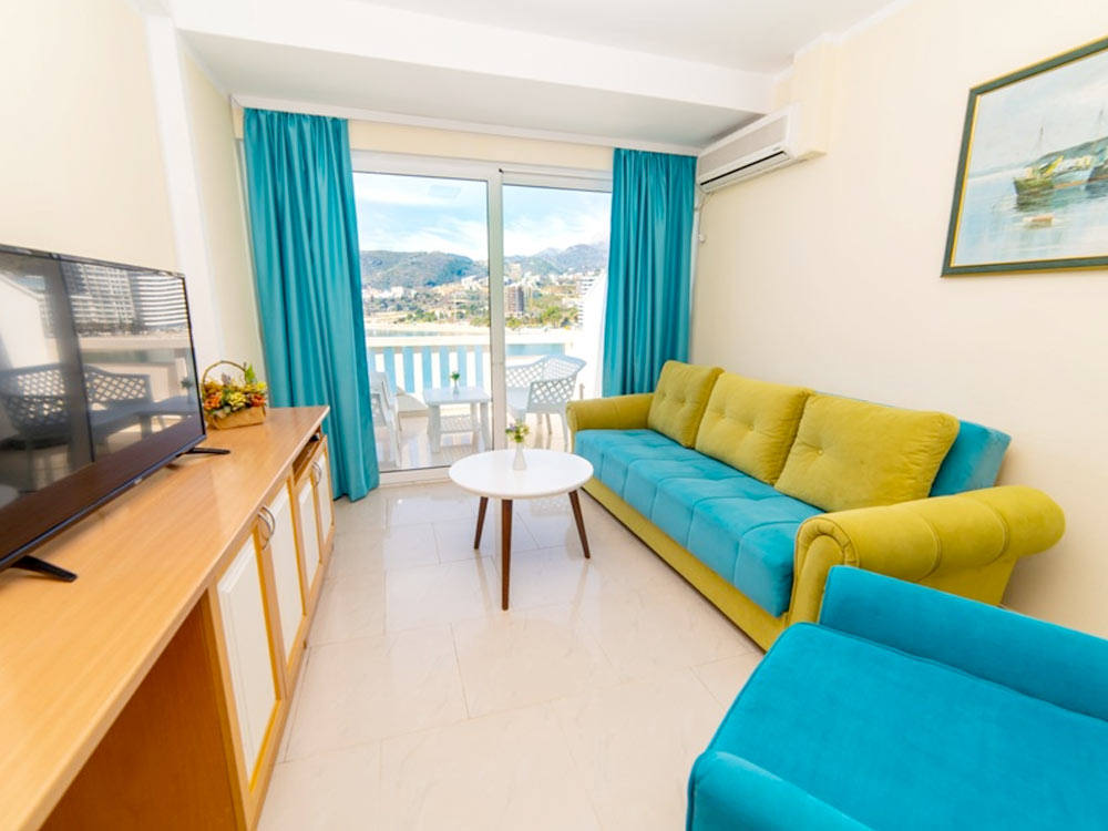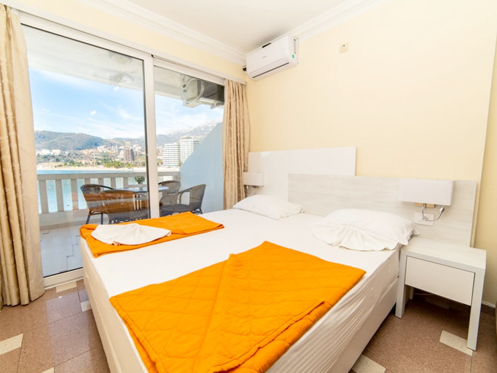 APP 04+2 Two Bedrooms Sea View: 60 m2+ 2 terraces: 6 m2 with sea view and 4 m2; living room with sofa bed + folding chair (or 2 folding chairs), kitchen (stovetop, kitchenware, electric kettle), two bedrooms: one bedroom with large double bed, second bedroom with double bed, bathroom with shower, washing machine. Maximum occupancy – 6 people.