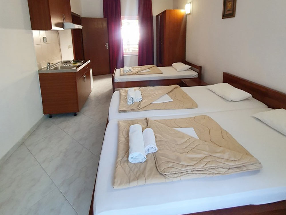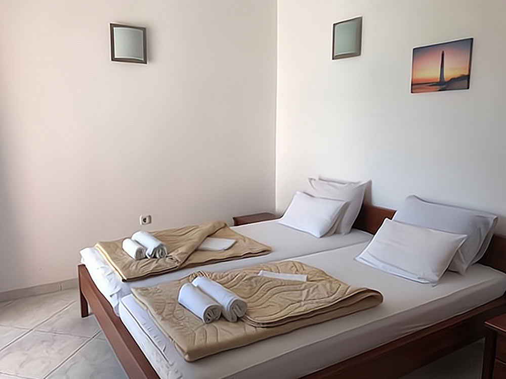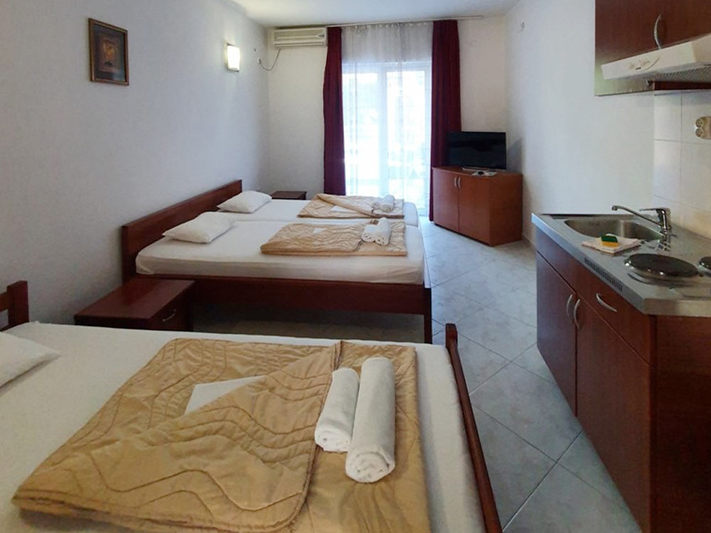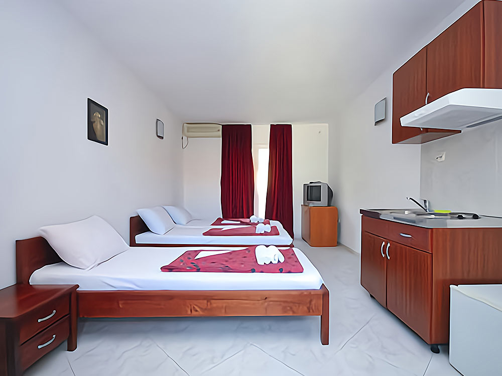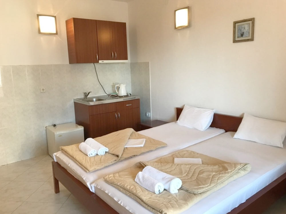 Studio 02+1 1st floor (№ 17, 18): 25 m2, exit to the common terrace, large double bed + separate bed, mini-kitchen, bathroom with shower.