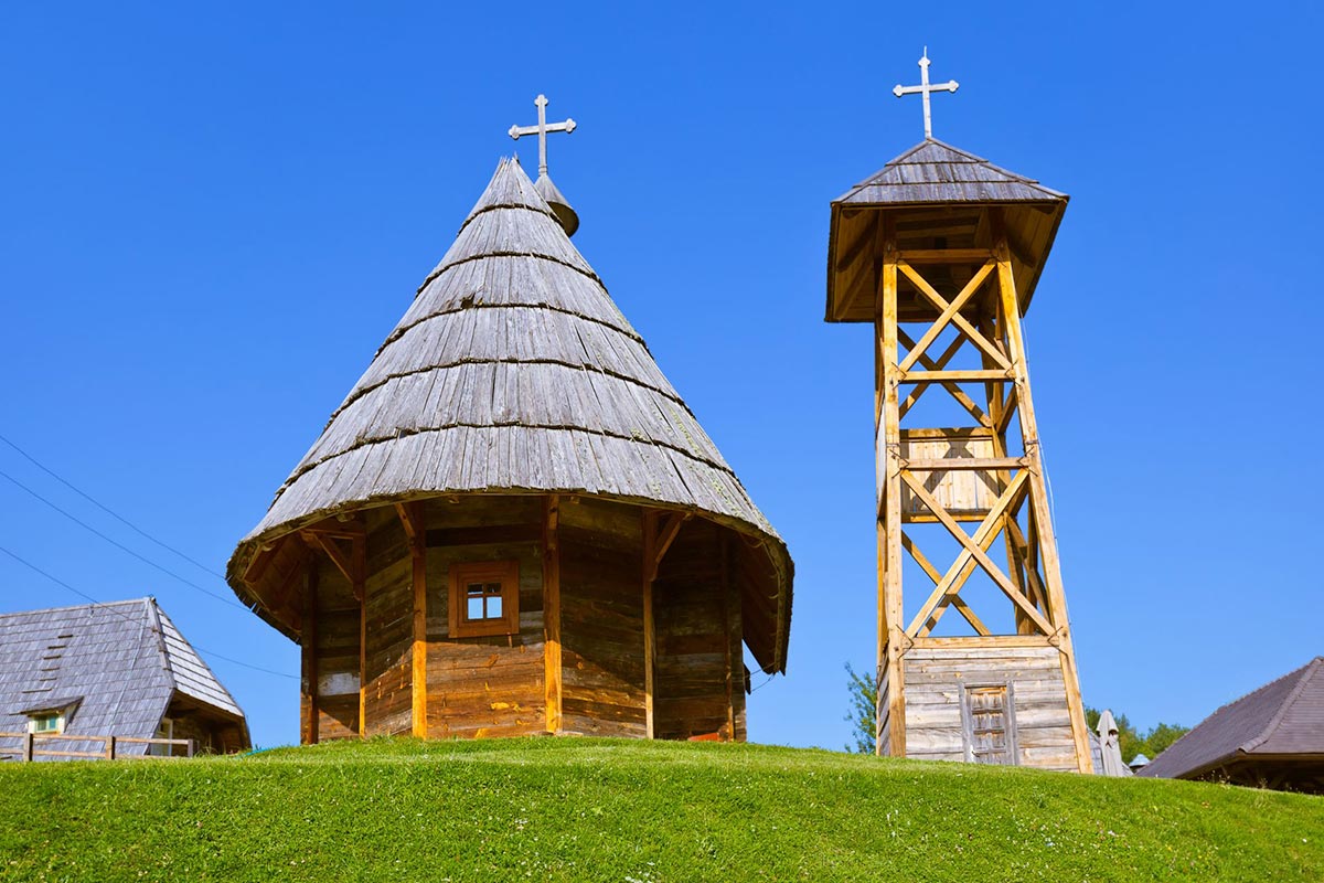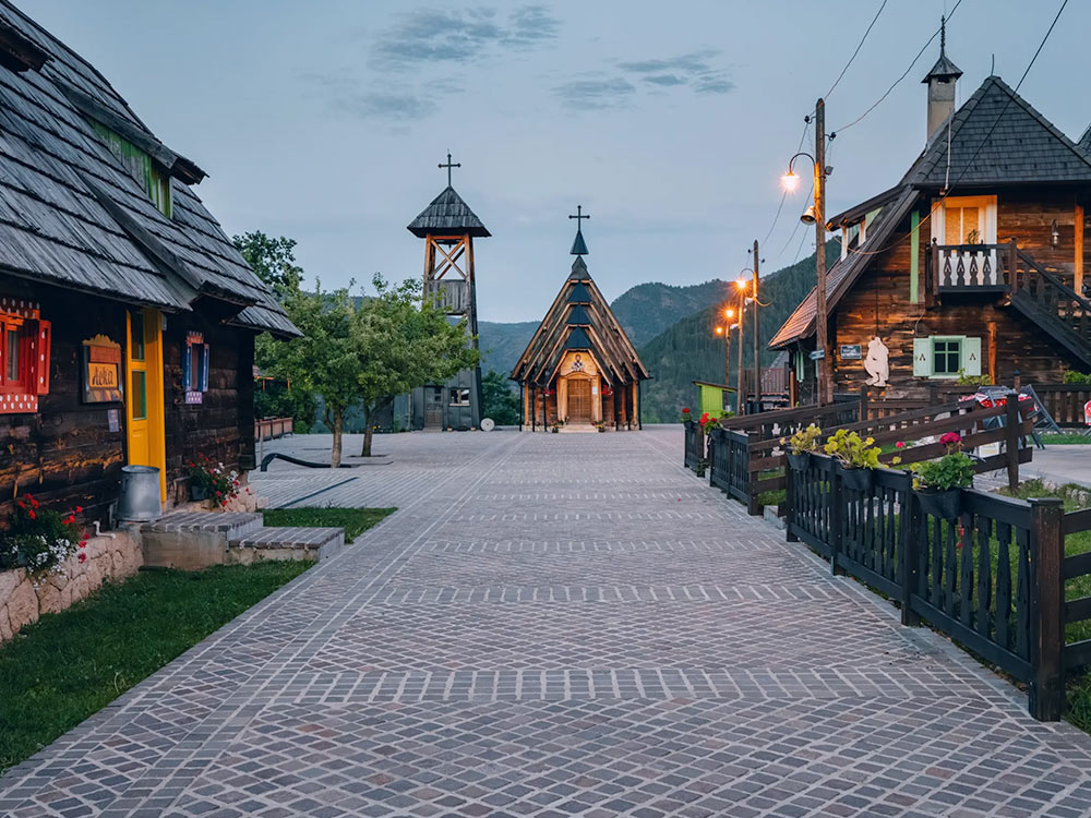 All buildings in Drvengrad are made of coniferous trees that cover the slopes of the surrounding mountains – Mokra Gora, Tara and Zlatibor. The streets are paved with stone and parts of old railway sleepers.