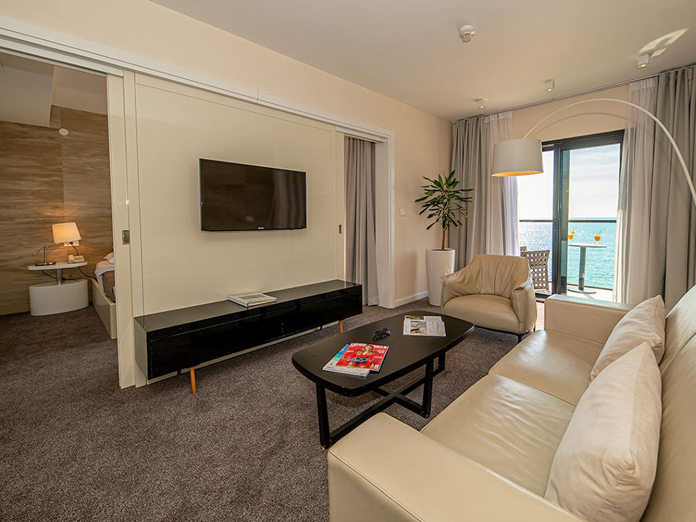 Apartment Sea View Terrace: 60 m2, terrace with sea view, living room with sofa and kitchenette, bedroom with large double bed, a private bathroom with shower. Maximum accommodation is 4 people.