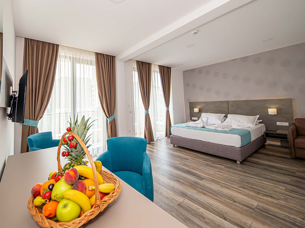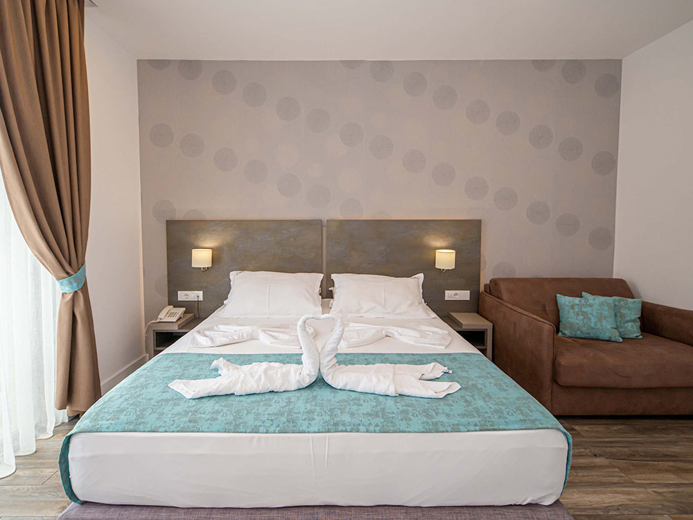 DBL Superior: 26m 22, balcony, French bed or two separate beds, air conditioning, cable TV, free Wi-Fi, private bathroom with shower, hairdryer. Maximum accommodation – 2 adults + child.