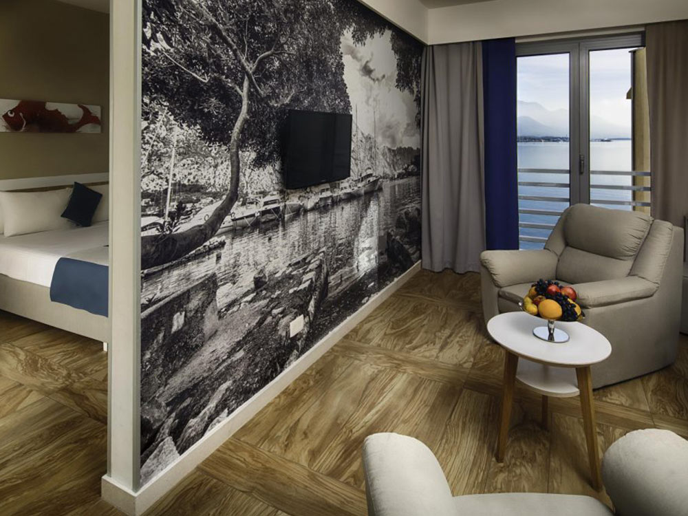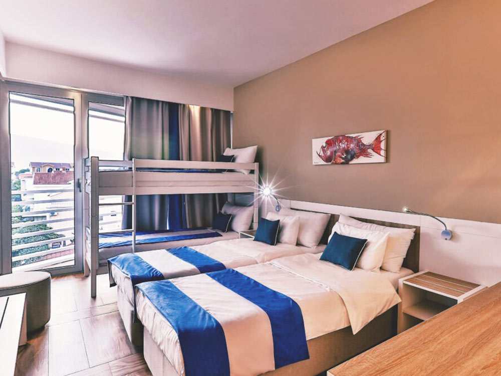 Suite SV: 44 m², big terrace with sea view, living room with sofa bed + bedroom with extra-large double bed, 2 bathrooms. Maximum occupancy – 3 adults or 2 adults +2 children under 13 y.o.