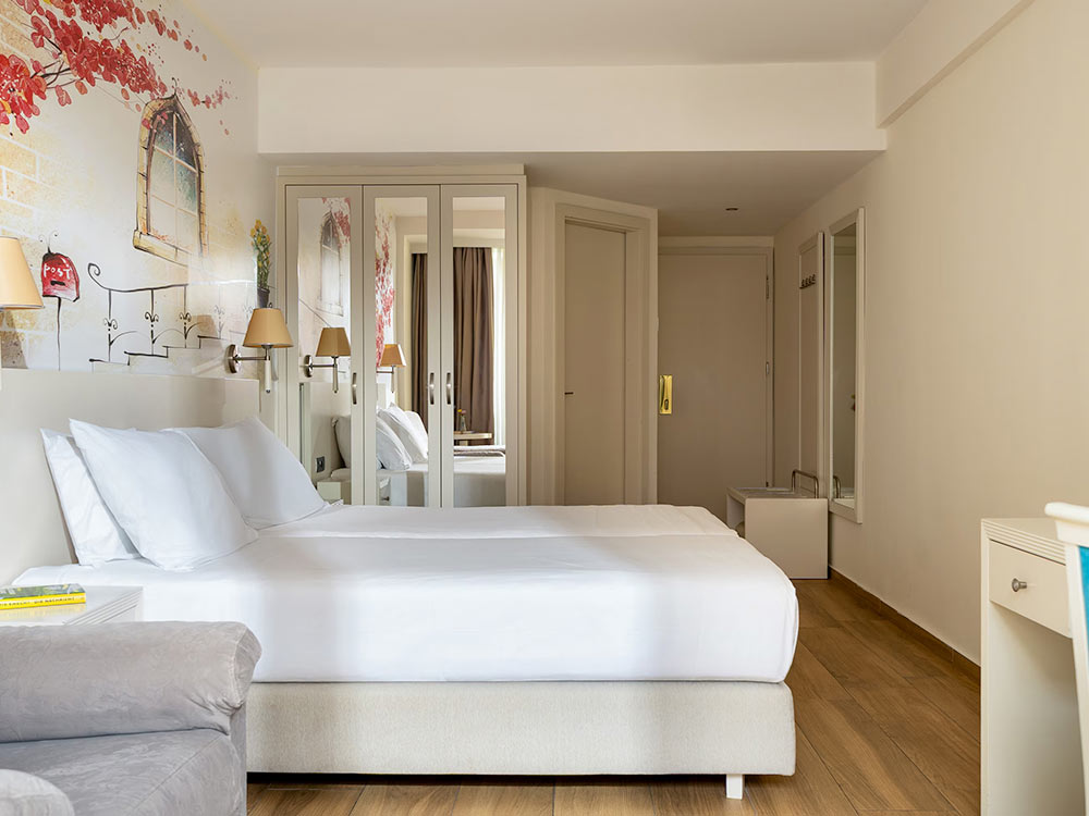 Double Garden View: 20-25m2, balcony with garden view, double bed (1,40x2 m) or twin beds, bathroom with shower or bathtub. Maximum occupancy is 2 adults + 1 child up 1to 5 y.o. or 3 adults.