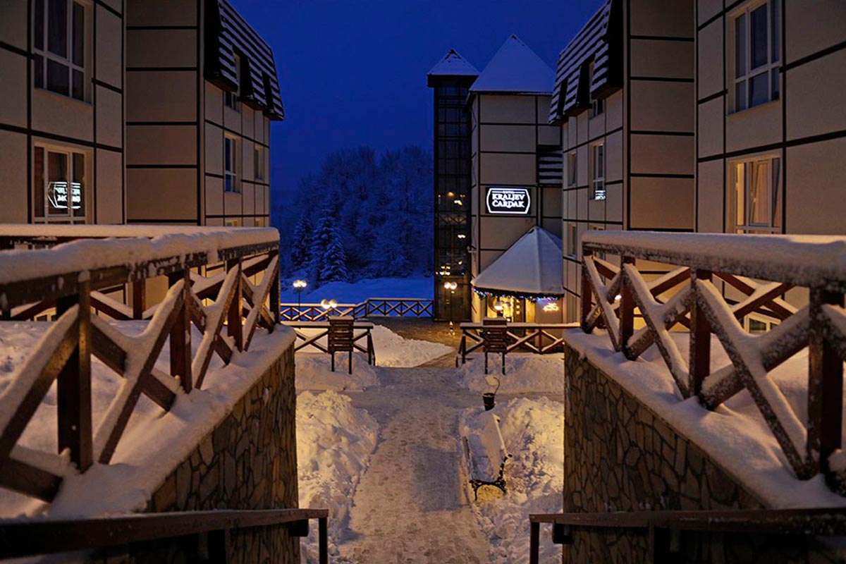 Modern rooms of various categories, boarding restaurant, a la cart restaurant, lobby bar, fireplace room, Wellness bar, pub, Spa center, indoor pool, outdoor pool, sauna, jacuzzi, beauty salon, gym, children’s playroom, free parking, free Wi-Fi, conference hall for 500 seats, shop, currency exchange, transfer to the ski lift.