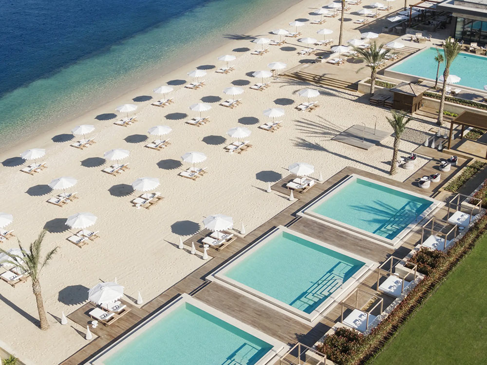 113 rooms, 3 restaurant, bars, lounge, outdoor swimming pools, free Wi-Fi, free private parking, 24-hour front desk, room service, Spa and wellness center – indoor pool, hot tub, gym, yoga classes, 2 tennis courts, kids’ club, currency exchange, private beach area.