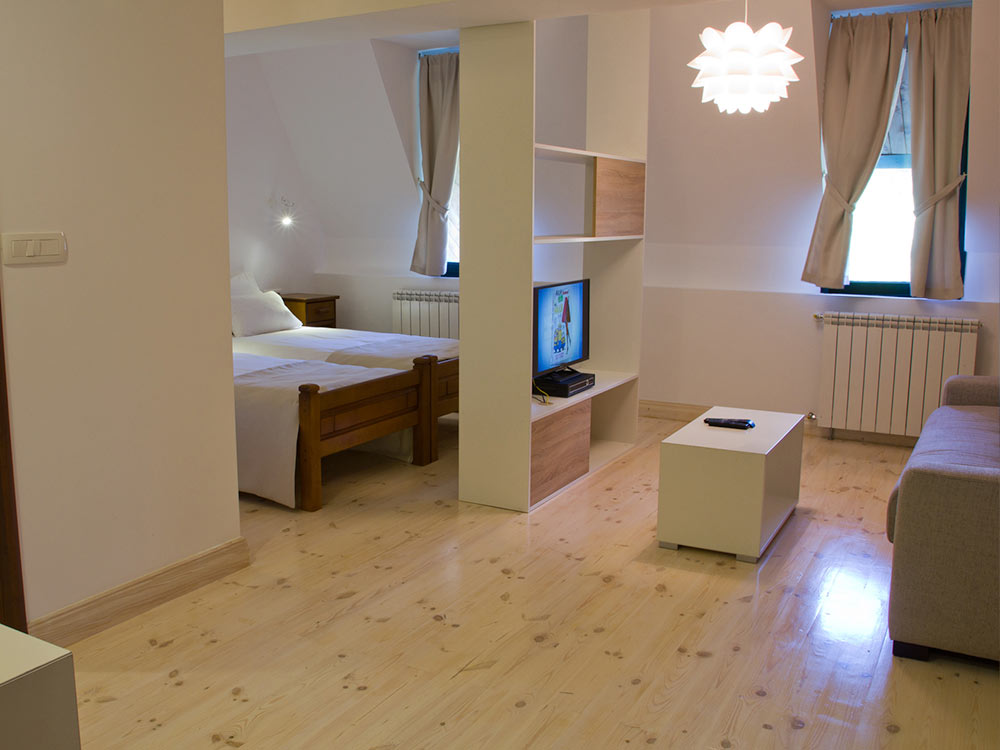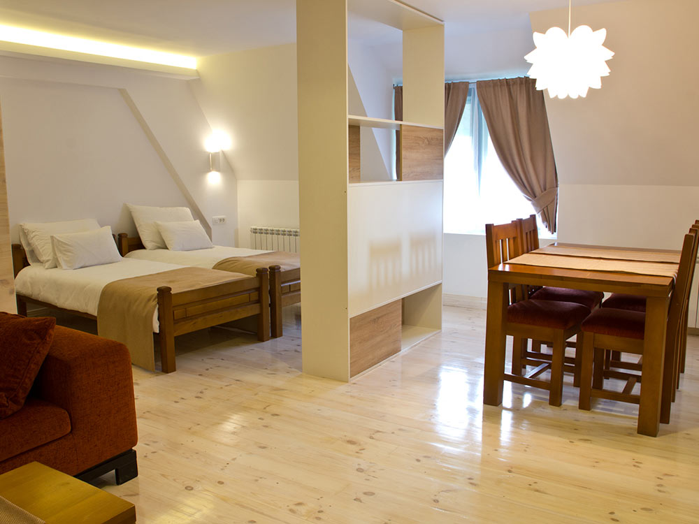 Designed in a traditional mountain style, in a homely atmosphere, surrounded by untouched nature, meadows and mountain ranges, it is a great place for relaxation and business meetings. The hotel is suitable for active family holidays – skiing, hiking, rafting on the Tara River and exciting excursions. It offers comfortable rooms and apartments, a small spa center and a children’s playground.