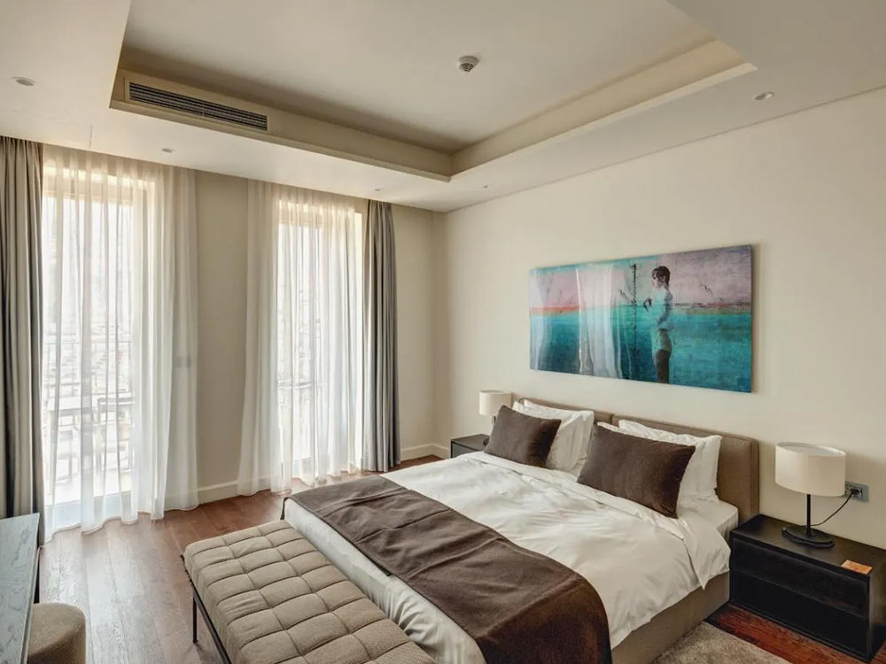 Portonovi Suite sv: 226 m2, balcony with sea view, living and dining room with kitchen, four double bedrooms, three bathrooms (bath or shower). Maximum occupancy – 8 people.