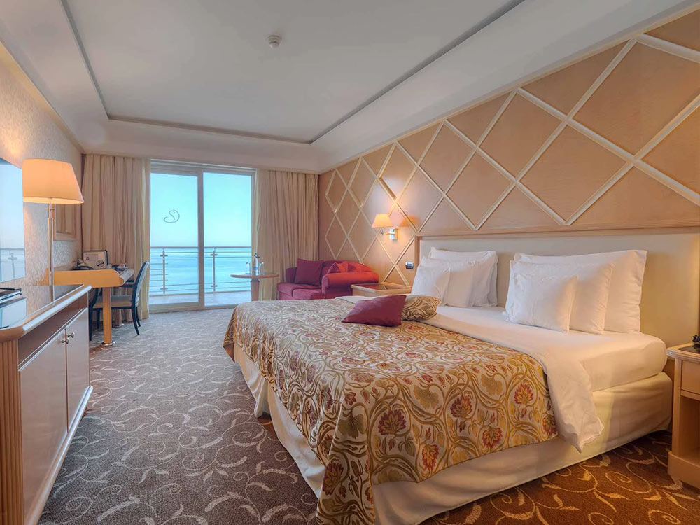Superior Sea View: 42 m2, balcony with sea view, extra-large double bed or two separate beds, sofa bed (1,90 m х 1 m), private bathroom with bathtub and shower. The maximum occupancy – 3 people.