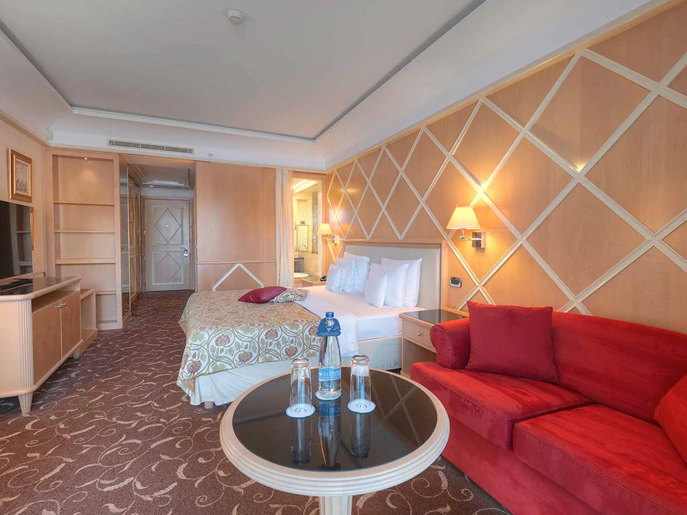 Junior Suite Sea View: 54 m2, balcony with sea view, bedroom with extra-large double bed, living room with sofa bed, private bathroom with bathtub and shower. The maximum occupancy – 2 adult +2 child up 12 y.o.