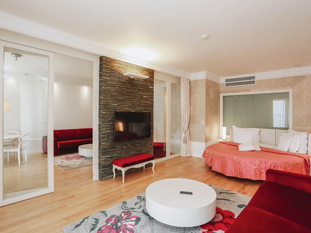 Family Suite: 84 m2, terrace with sea view, living room with two sofa beds (160x190cm), bedroom with double bed, dressing room, bathroom with hot tub & shower. Maximum occupancy: 6 adults