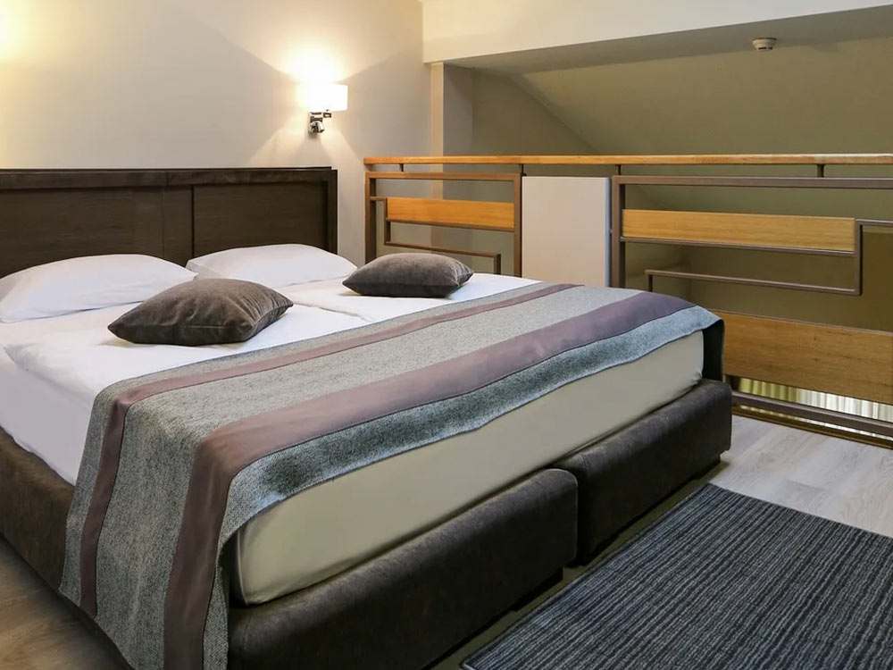 DBL Superior Duplex: 50 m2, terrace or French balcony, bed (200x200) on the second floor, sofa (145x190) in the living room, 2 TV, safe, phone, hair, Wi-Fi, minibar (cage), 2 bathrooms. Maximum occupancy: 3 adults or 2 adults + 2 children.