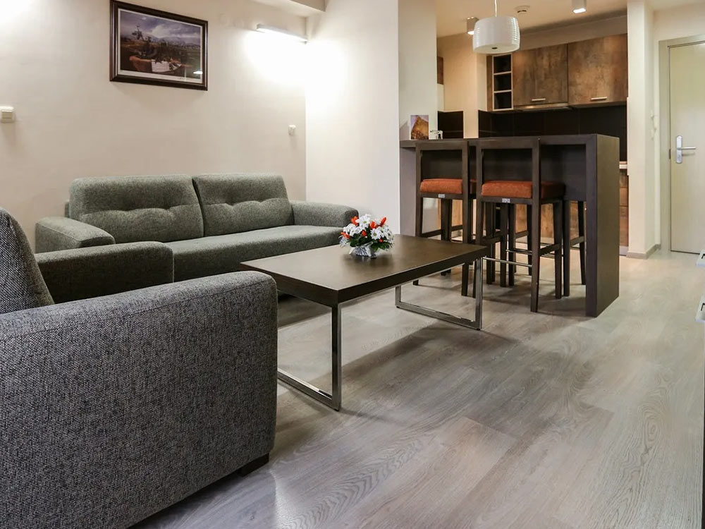 Junior APP: 50-79 m2, terrace or French balcony, bed (200x200) in the bedroom and sofa (145x190) in the living room, 2 TV, safe, telephone, hairdryer, Wi-Fi, mini-bar (cage). Maximum occupancy: 3 adults or 2 adults + 2 children.