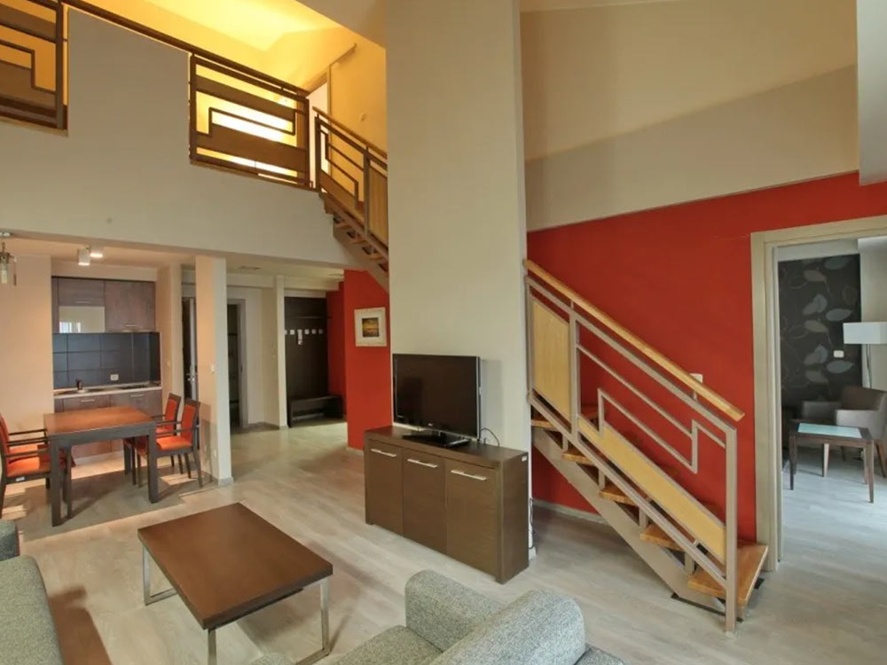 Family Duplex APP: The suite has 2 living rooms on 2 levels with sofa beds on both levels, as well as a kitchen and dining table on the first floor. It also has 2 separate bedrooms and bathrooms on both levels.