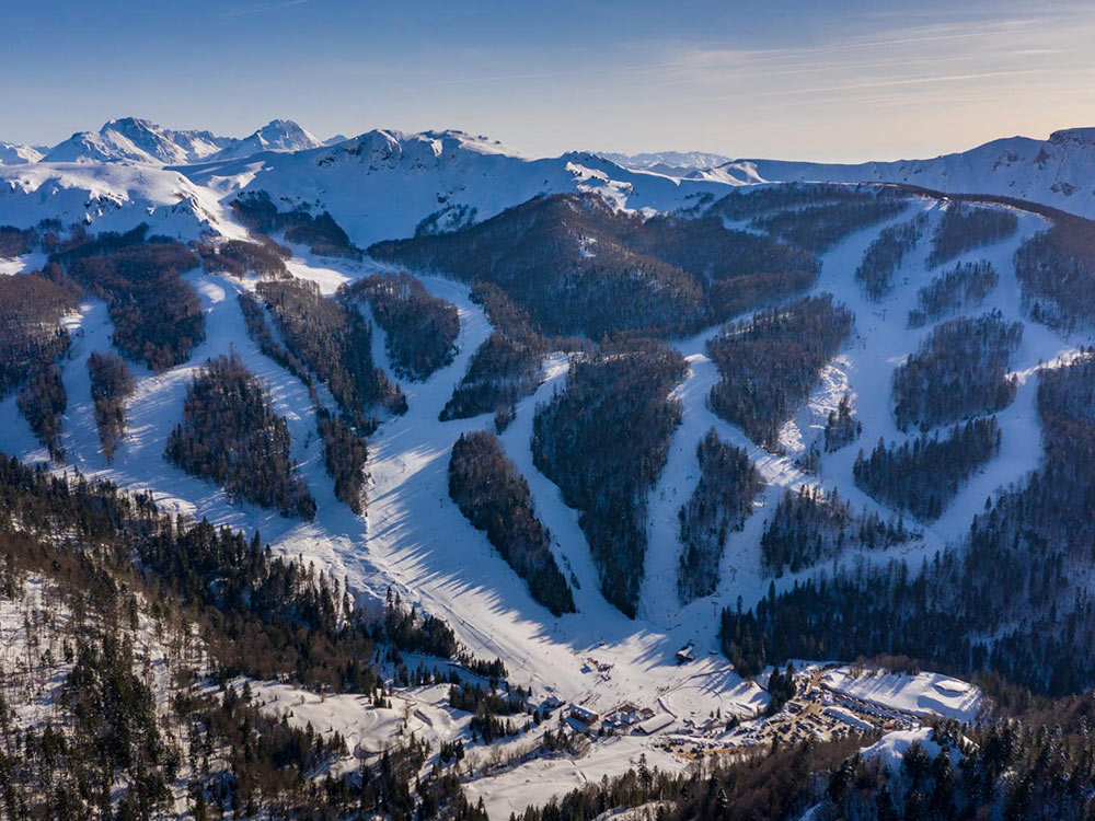 The new ski resort Kolašin 1600 opened in 2020 with black, red and blue slopes, as well as children’s slides. The maximum length of the route is 10.5 km. Wi-Fi is available on the territory of the ski centre, a ski school for children and adults. There is a restaurant with an open terrace where all products are grown in Kolasin’s households (slanting, smoked meats, meat and cheese products) and are used to prepare Eco dishes. There are no snow cannons on the territory of the resort – only natural snow, and the skiing season usually starts on December 15th. A modern cable car will take you to the highest point of the resort – 2035 m, with beautiful panoramic views of the mountain ranges of the Prokletije National Park.