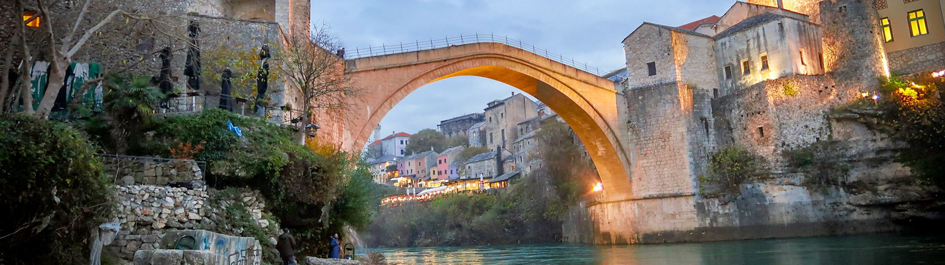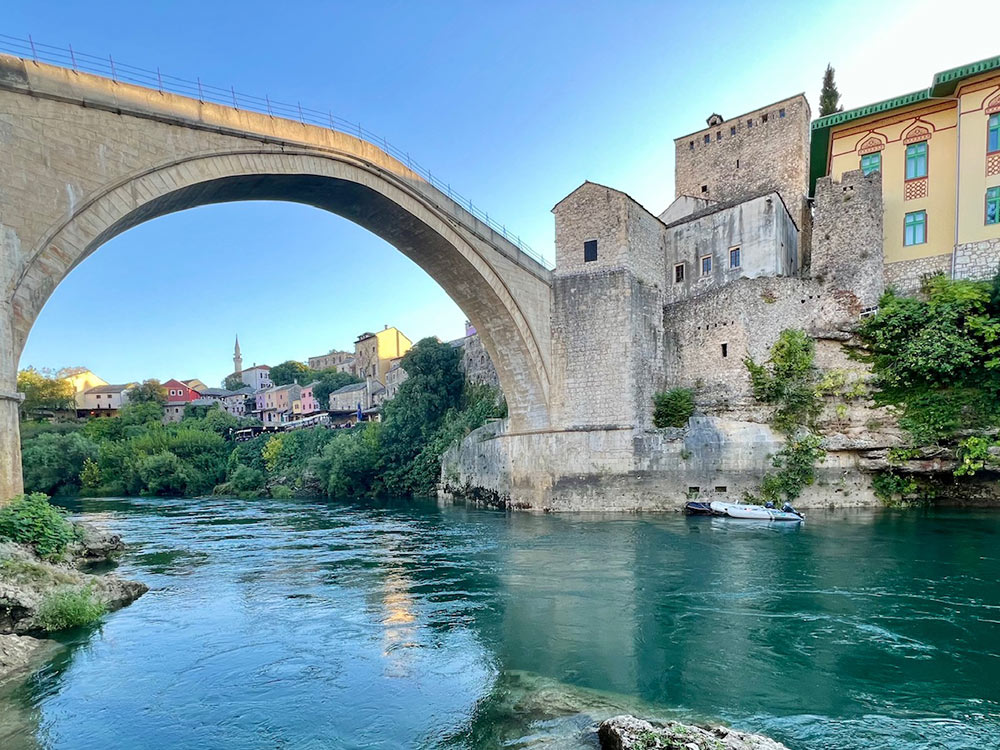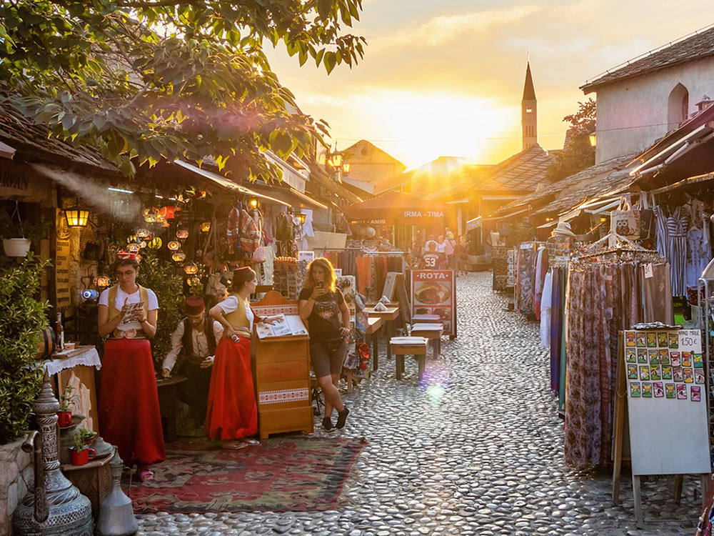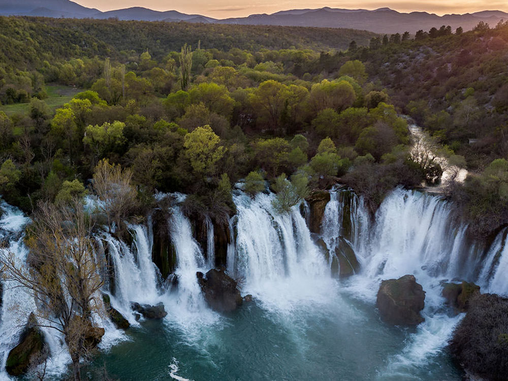 We then continue our excursion to the Kravice Waterfalls — a national park where streams of white water cascade from a height of 25 meters, shimmering with hundreds of rainbows as they plunge into the turquoise pool below. After enjoying the natural beauty and time for swimming, we head toward Mostar.