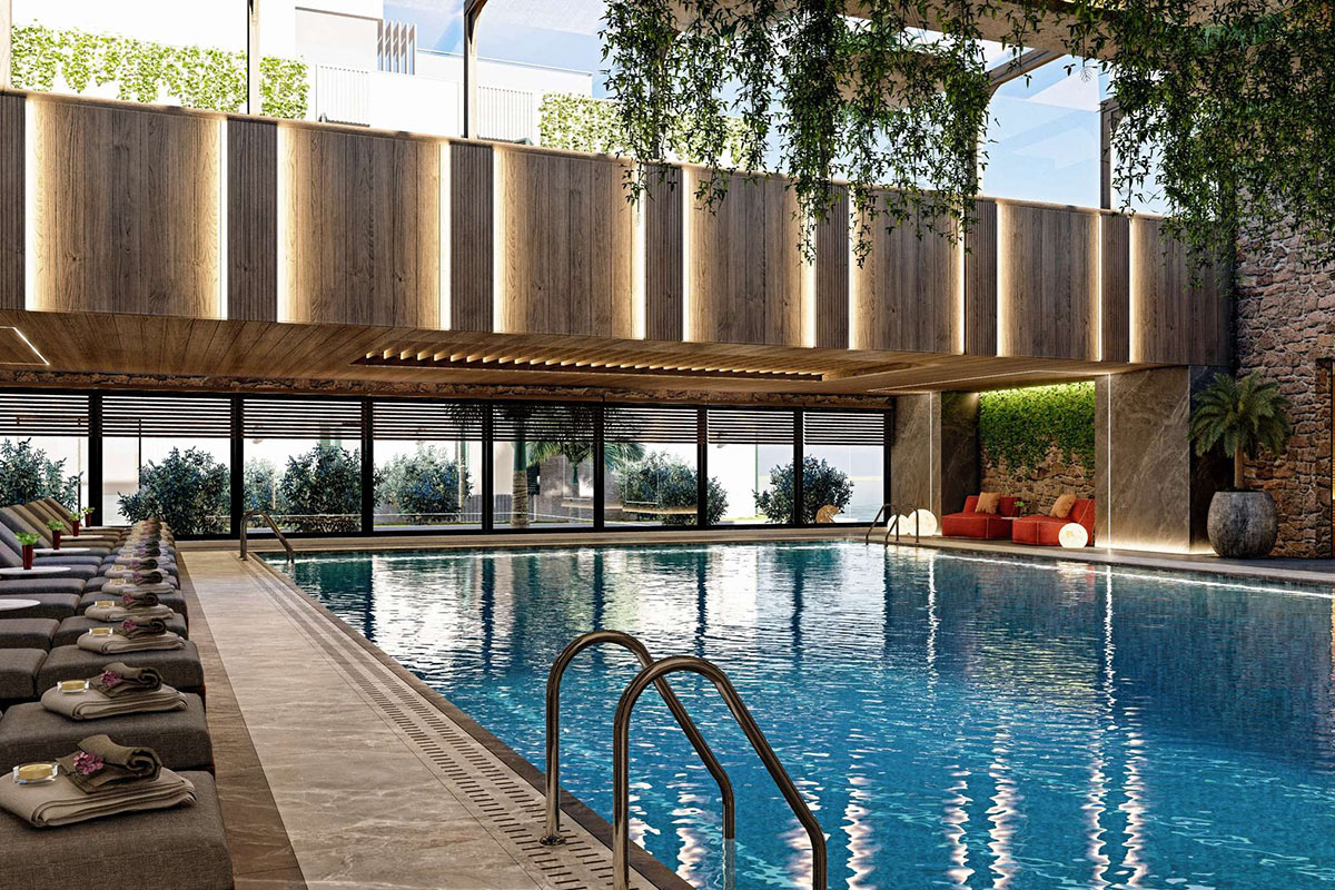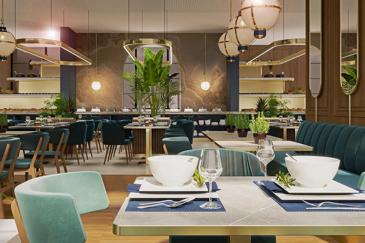SPA- and fitness center with an indoor infinitive pool, a gym and a yoga space, a vitamin bar and a healthy food area, its own sandy beach and a beach bar, an outdoor pool and a children's pool, Kids' Club, coworking and meeting rooms, private pier, a variety of restaurants including rooftop and beachside, shopping area: beauty salon, boutique.