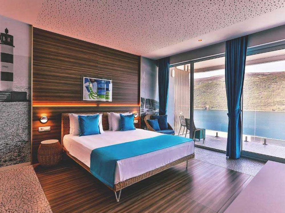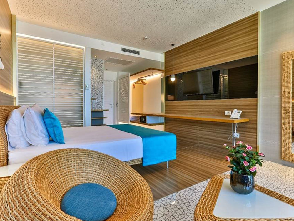 Deluxe Side Sea View: 32м2, балкон с боковым видом на море, французская кровать или две раздельные кровати + диван-кровать, собственная ванная комната с душем. Максимальное размещение — 3 человека или 2 взрослых + 2 детей до 12 лет.