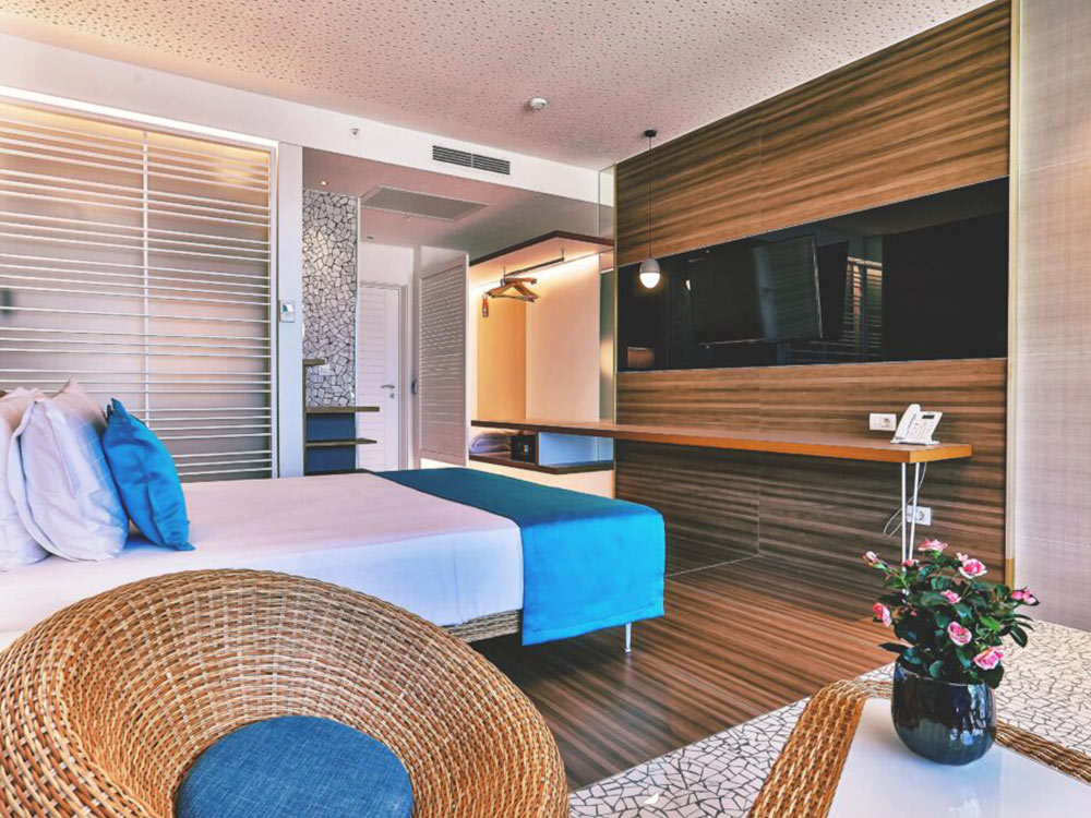 Deluxe Sea View: 32м2, балкон с видом на море, французская кровать или две раздельные кровати + диван-кровать, собственная ванная комната с душем. Максимальное размещение — 3 взрослых или 2 взрослых + 2 детей до 12 лет.