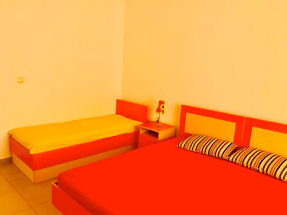 APP 05 (№5,8): 58 м2 + терраса 12 м2, большая гостиная с кухней (плита с духовкой), раскладной диван + раскладное кресло, выход на террасу. В спальне две кровати, которые могут быть составлены вместе + дополнительная кровать. Душ с поддоном, без занавески. Терраса угловая — вид во двор и на детскую площадку. Примечание: кондиционер только в гостиной.