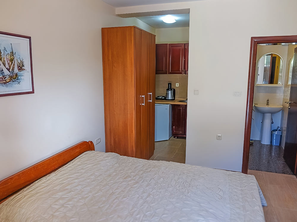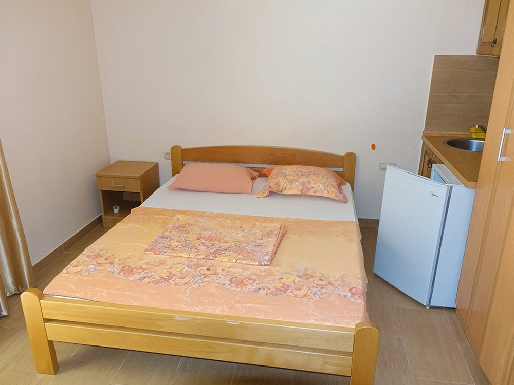 Studio 02: французская кровать, мини-кухня, ванная комната с душем. Максимальное размещение — 2 чел.