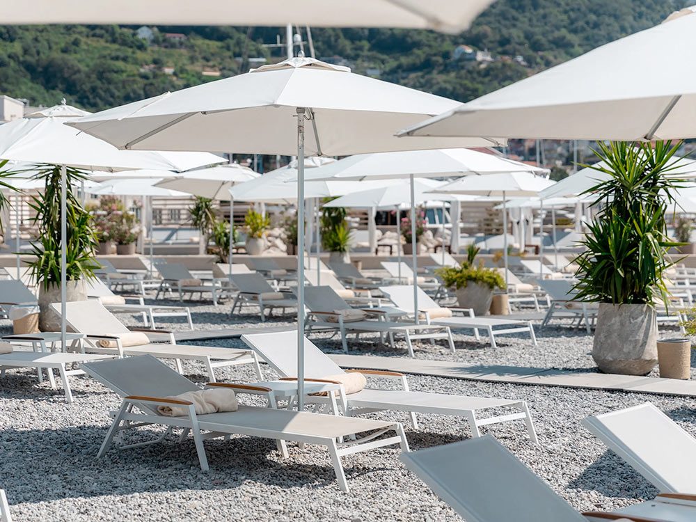 Частный пляж 150 м — мелкая галька, песок. Шезлонги, зонтики и пляжные полотенца — бесплатно.