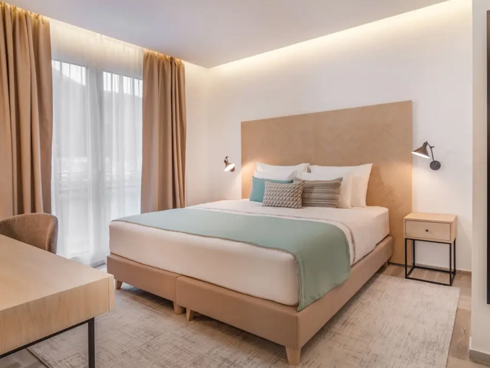 Студия с кухней: 40–66 м², большая двуспальная кровать (200 × 200 см) или две односпальные кровати, гостиная зона с диваном и кухонным уголком, ванная комната с душем. Максимальная вместимость — 3 человека.